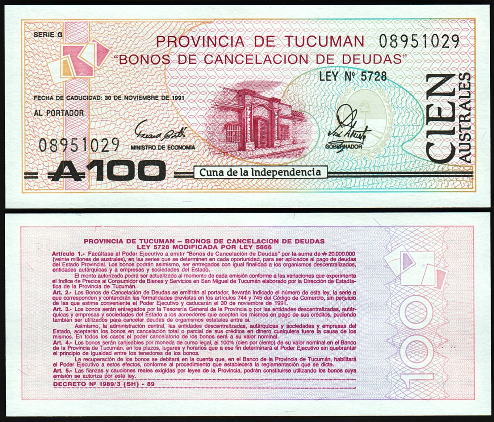 Argentina 100 Australes Povincia de Tucuman 1991, P-S2715