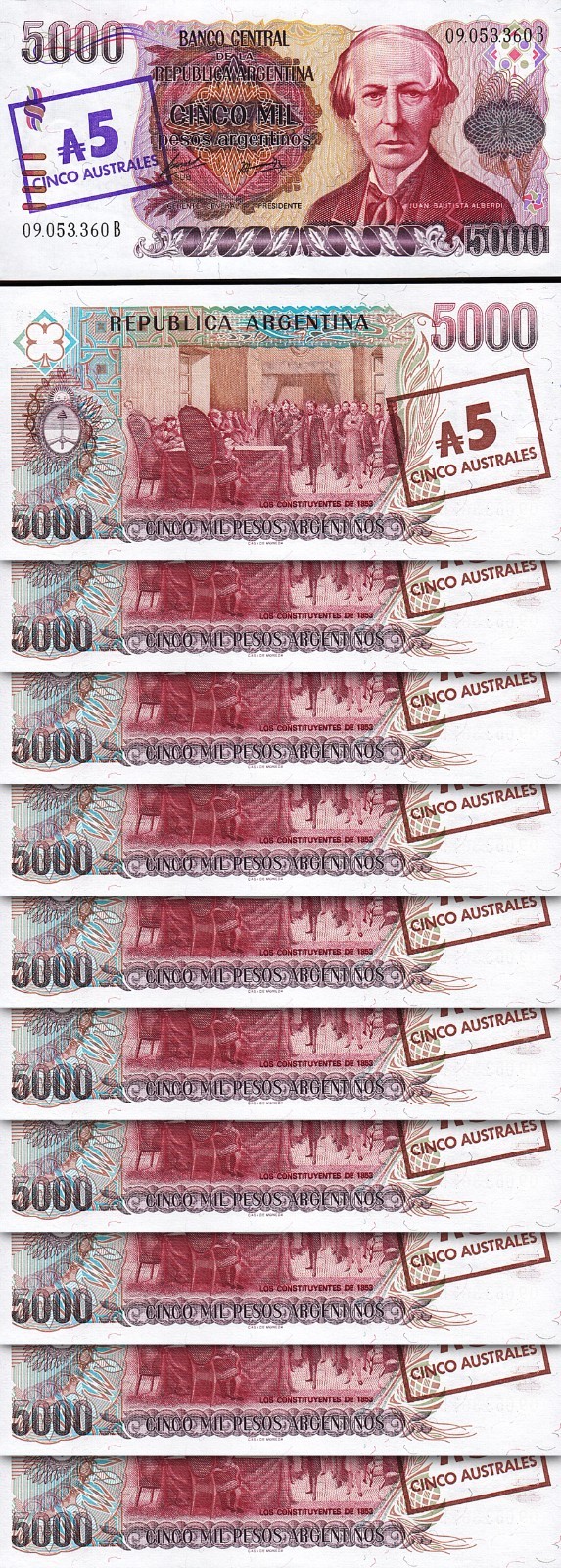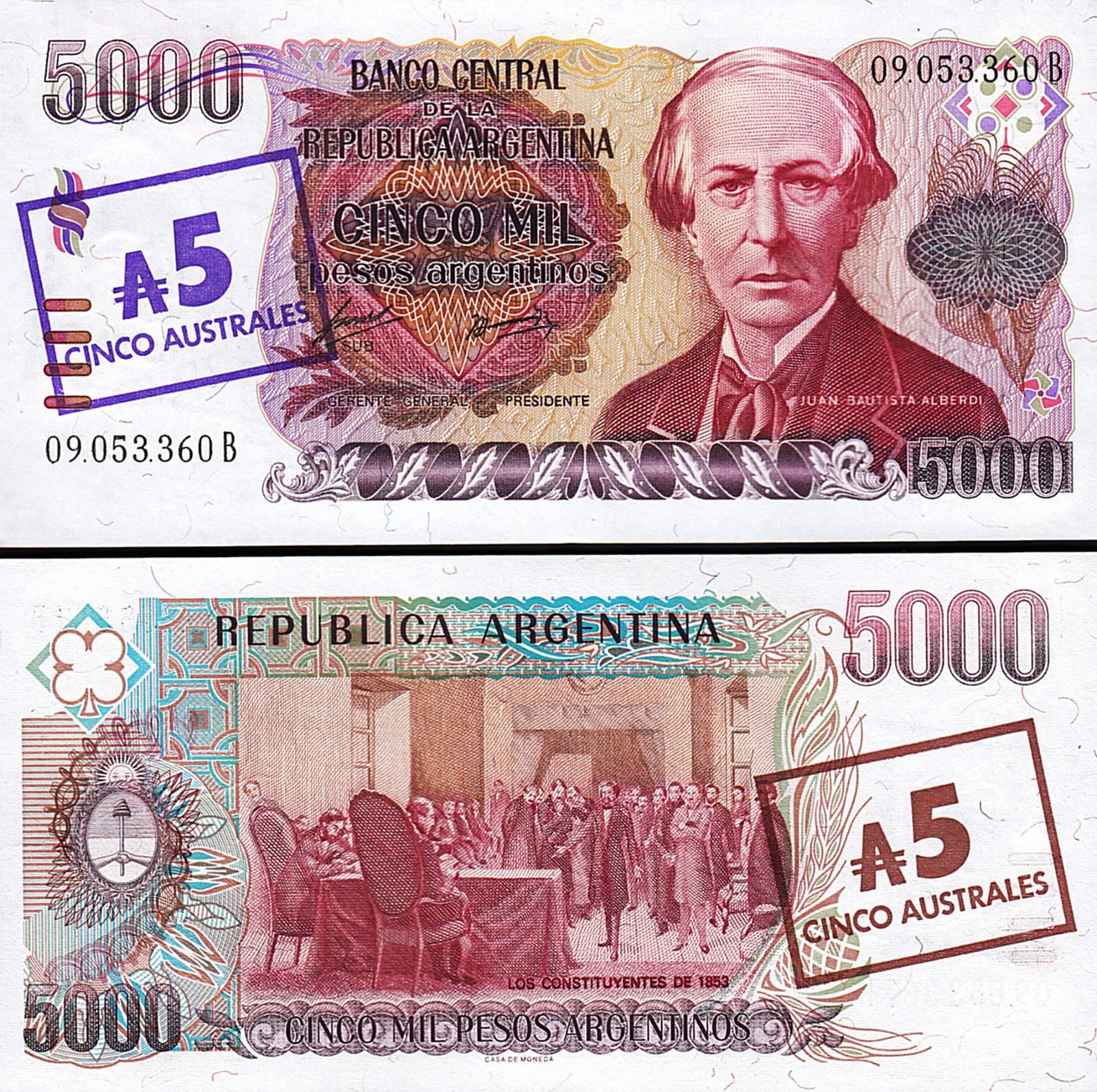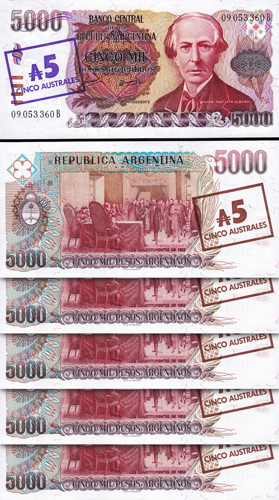Argentina 5 Australes on 5000 Pesos 1985 Overprint, P-321