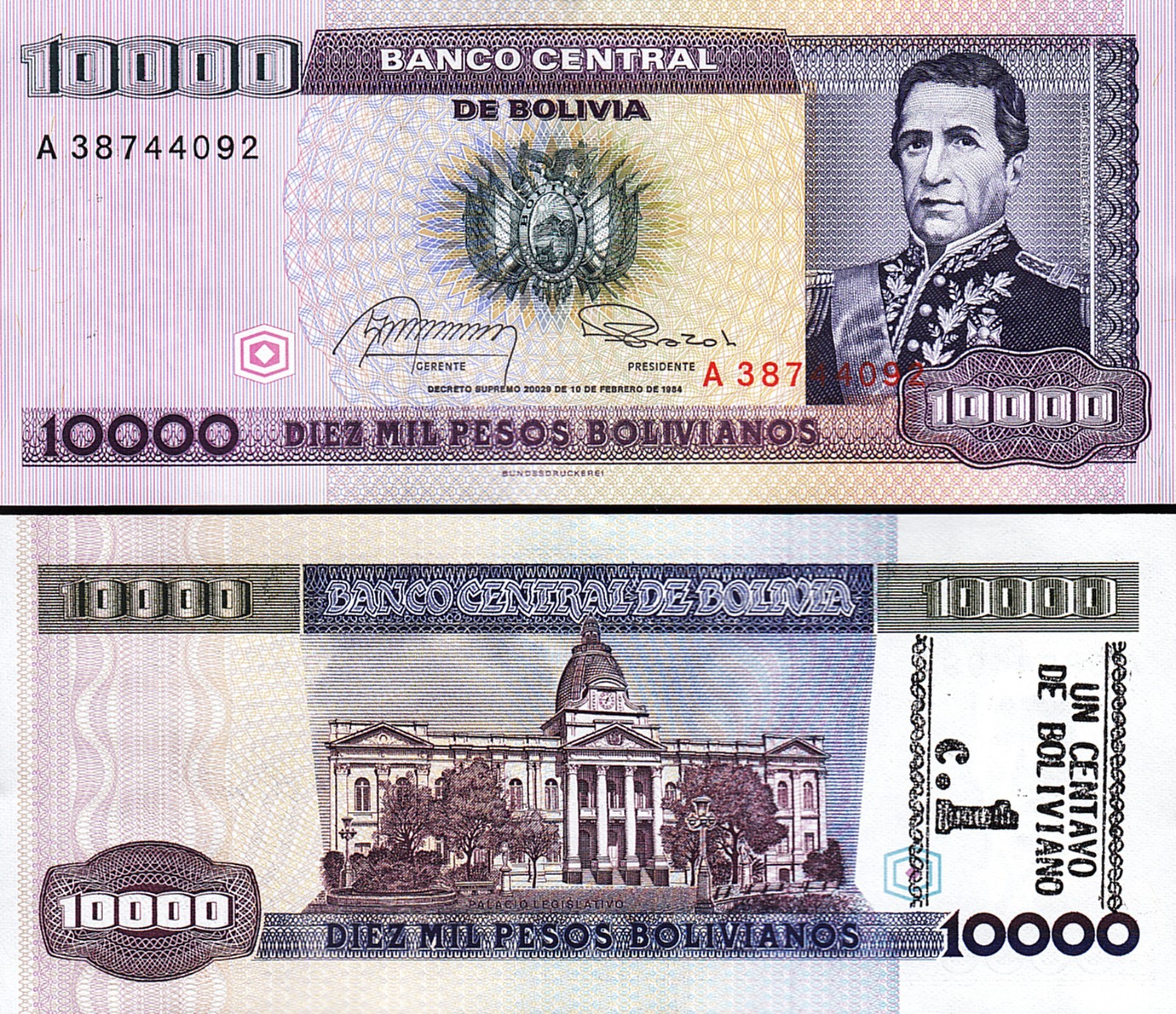 BOLIVIA 1 CENTAVOS ON 10,000 PESOS BOLIVIANOS 1987