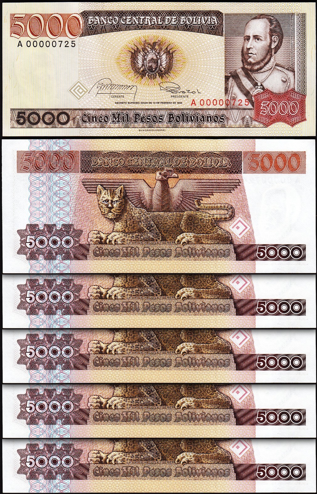 BOLIVIA 5000 PESOS BOLIVIANOS 1984, P-168a, PREFIX A
