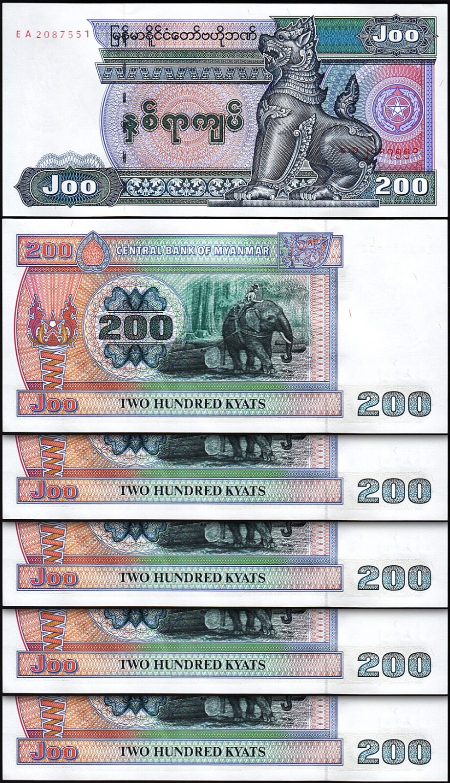 Burma Myanmar 200 Kyats Nd 1995 1998, P-75b, Large Size Issue