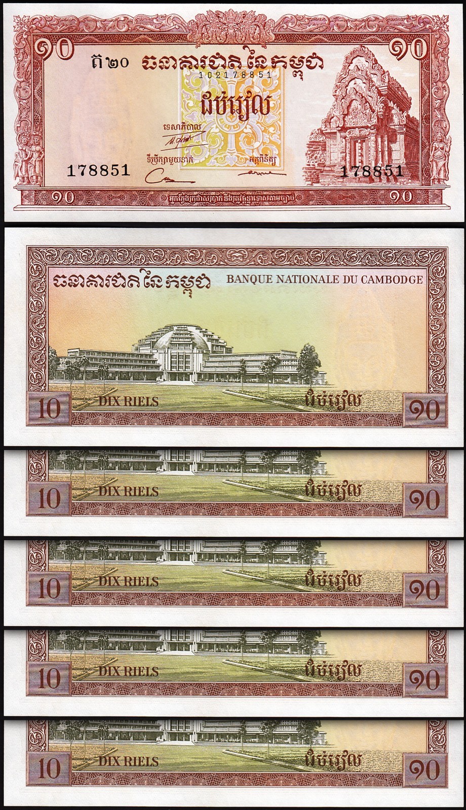 CAMBODIA 10 RIELS ND 1962-1975, P-11d, 6 DIGIT SERIAL