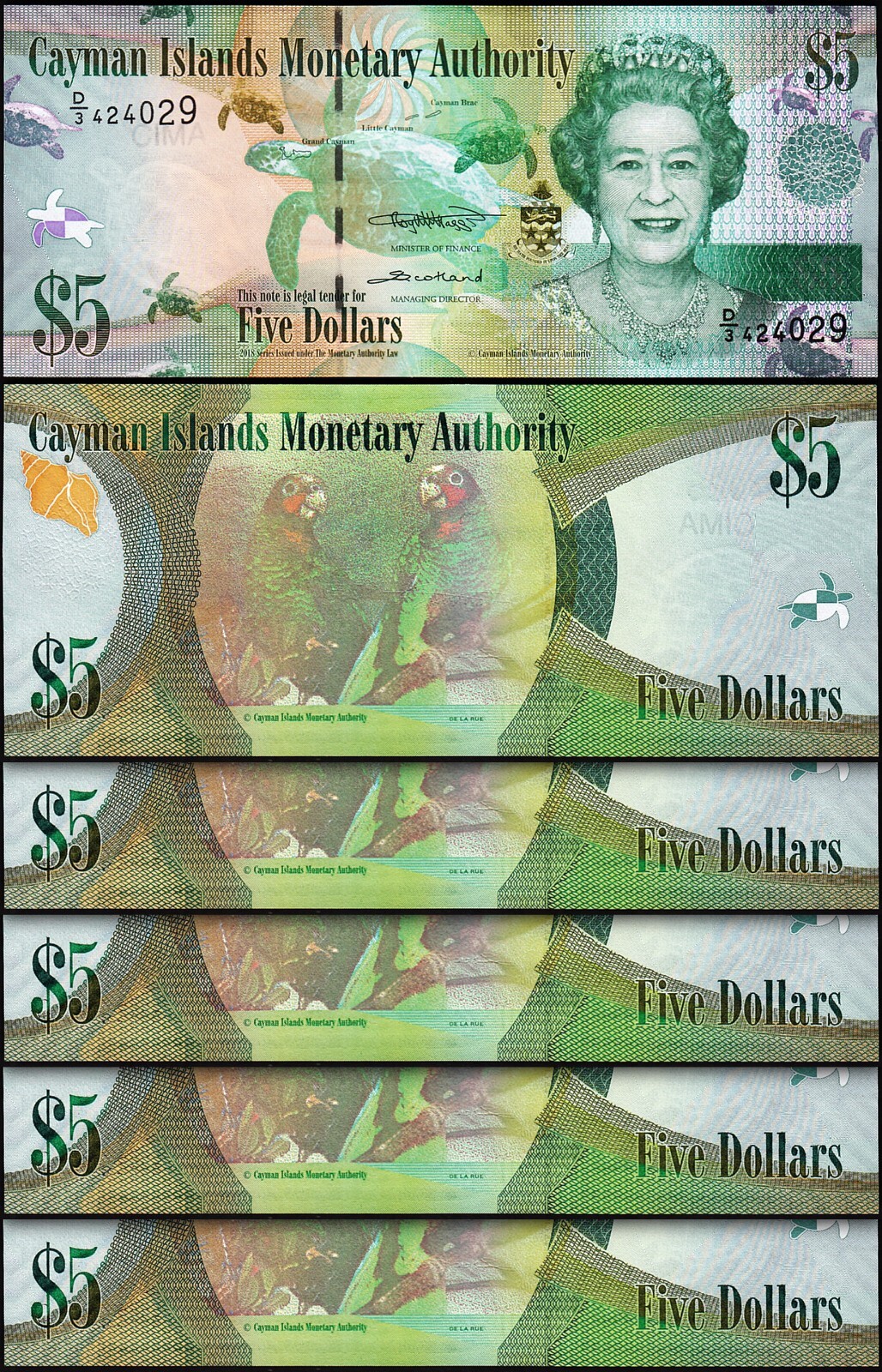 Cayman Islands 5 Dollars 2018, QEII, Prefix D/3, P-39c