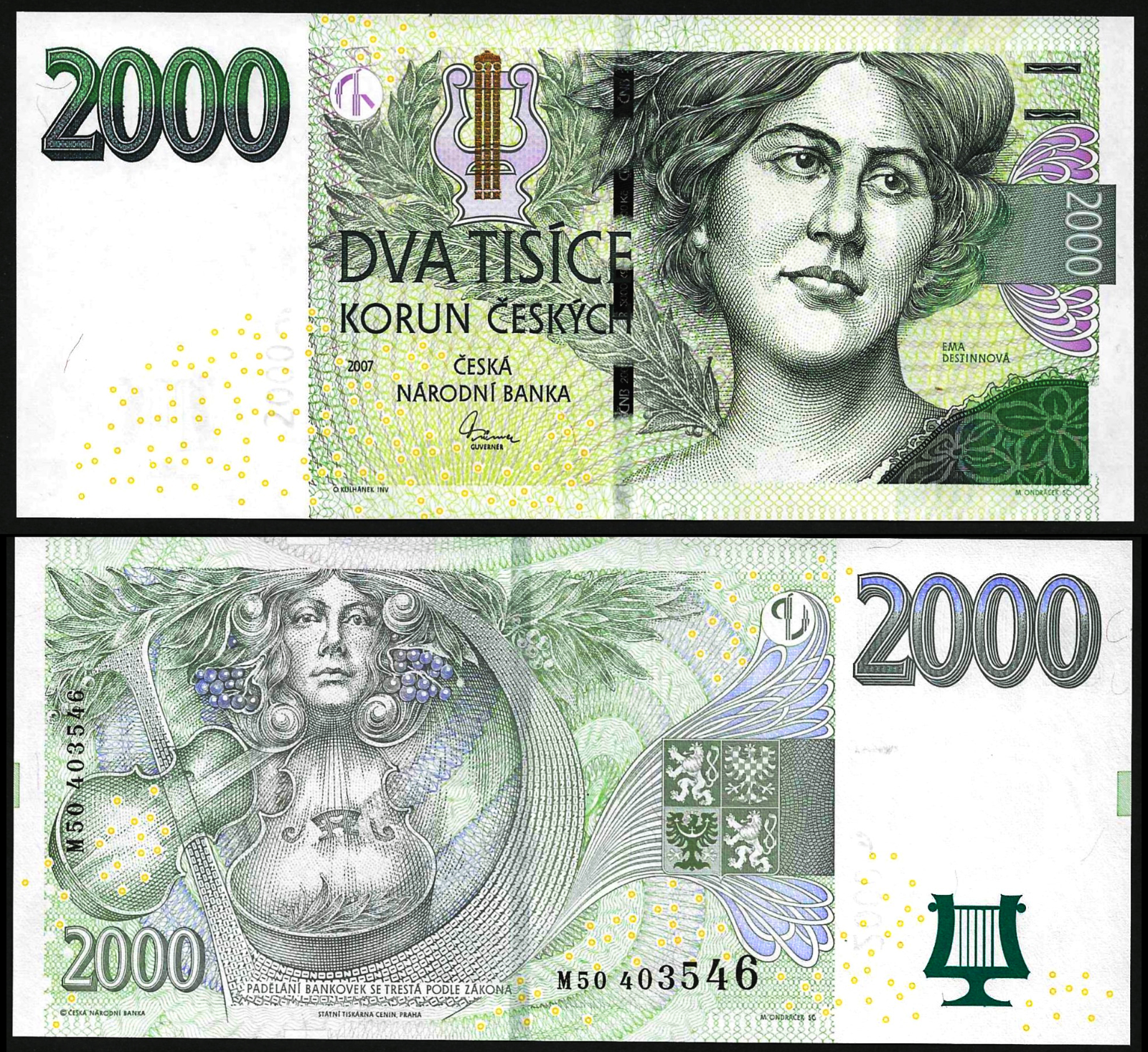 Czech Republic 2000 Korun 2007, UNC, P-26, Prefix M