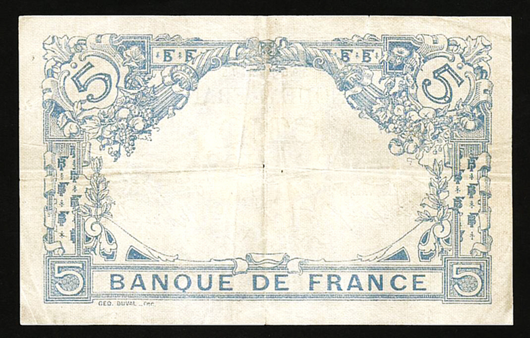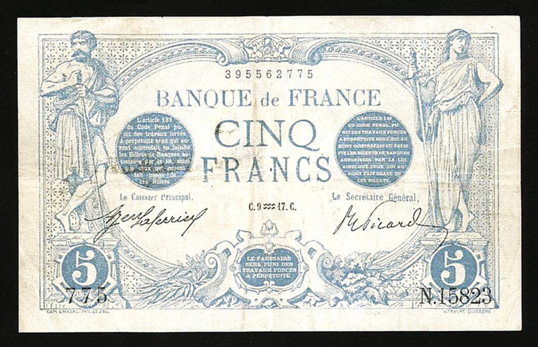 FRANCE 5 FRANCS 1917 aVF P.70 , BLEU