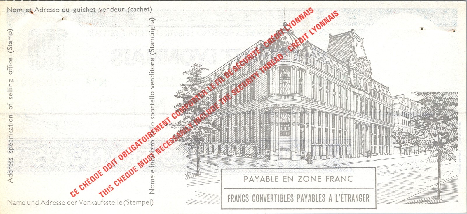 France Lyonnais SPECIMEN, Traveller Cheque, 100 Cent Francs UNC, Watermark