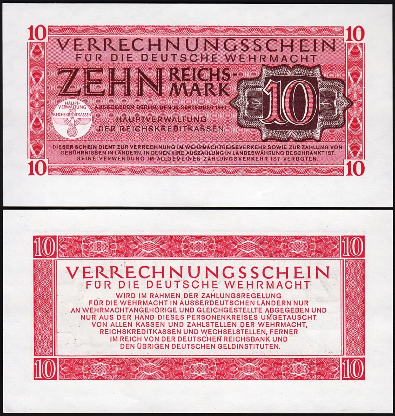 10 Reichsmark 1944, UNC, P-M40, Completely Watermark