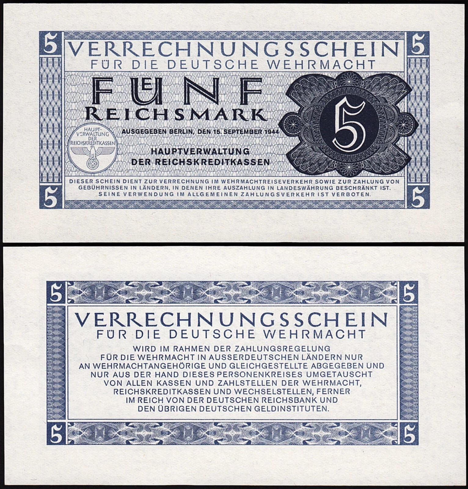 5 Reichsmark 1944, UNC, P-M39, Completely Watermark