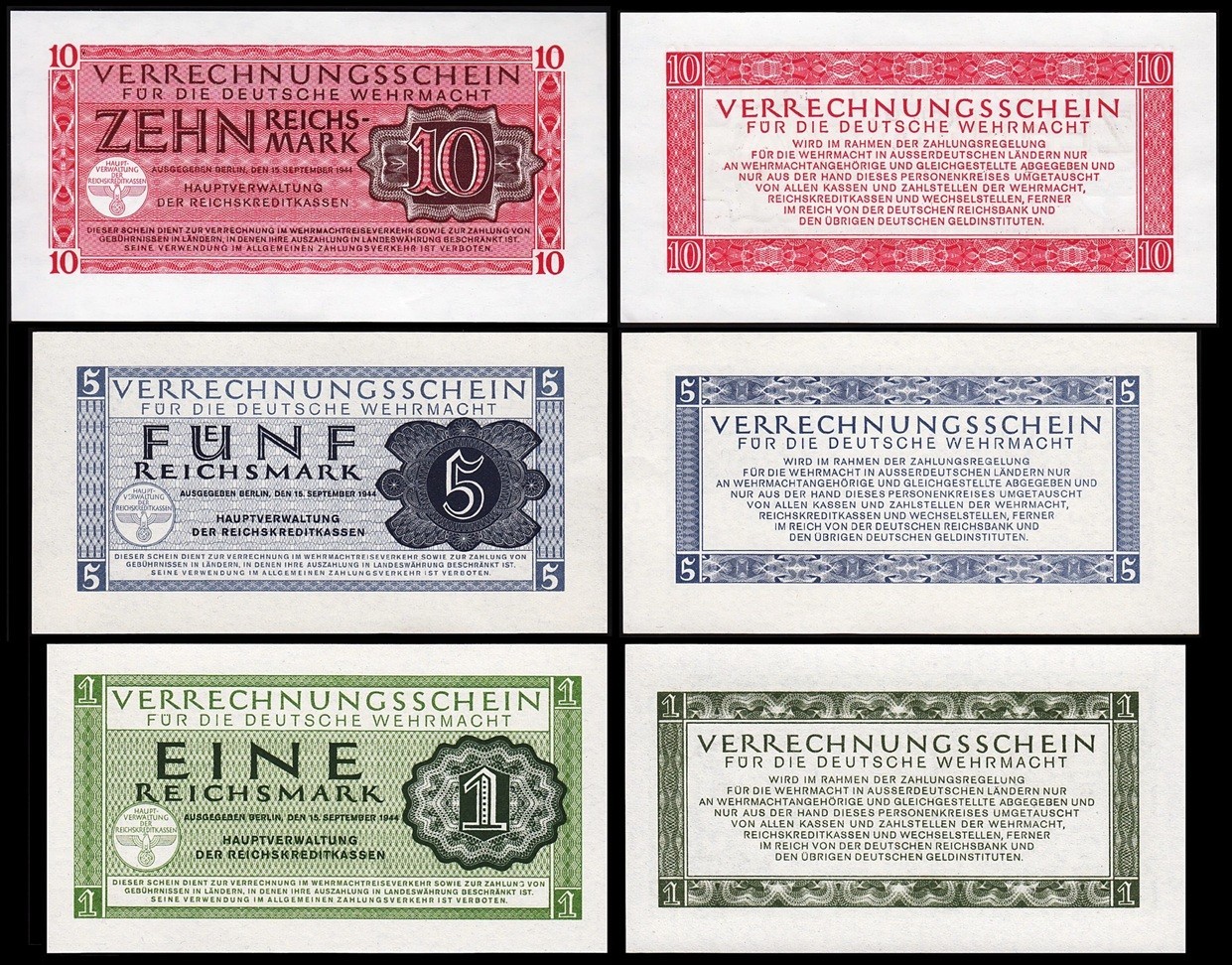 Germany 3 Pcs Set 1 5 10 Reichsmark 1944, UNC, P M38 M39 M40