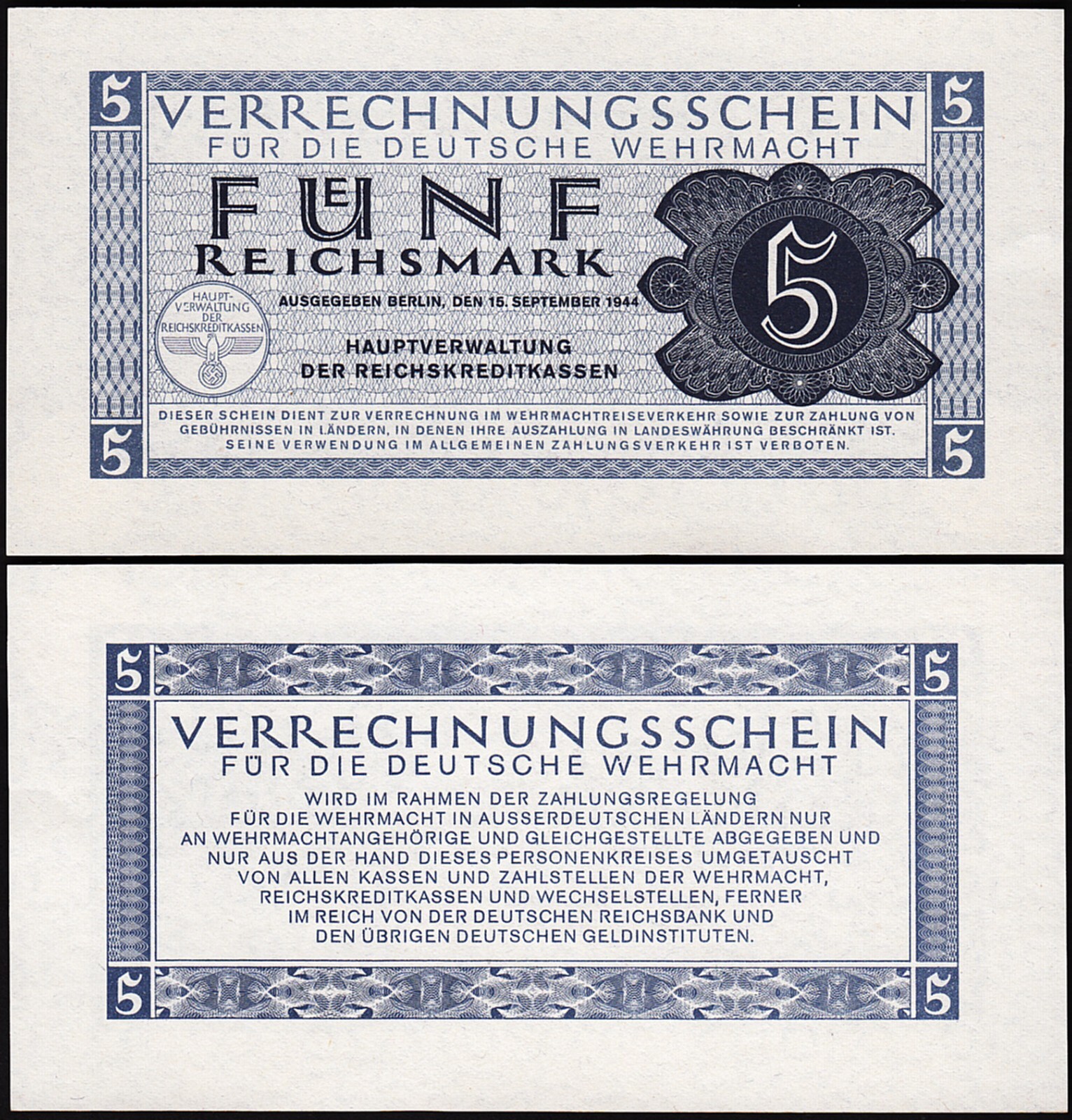 Germany 5 Reichsmark 1944, P-M39, with Completely Watermark