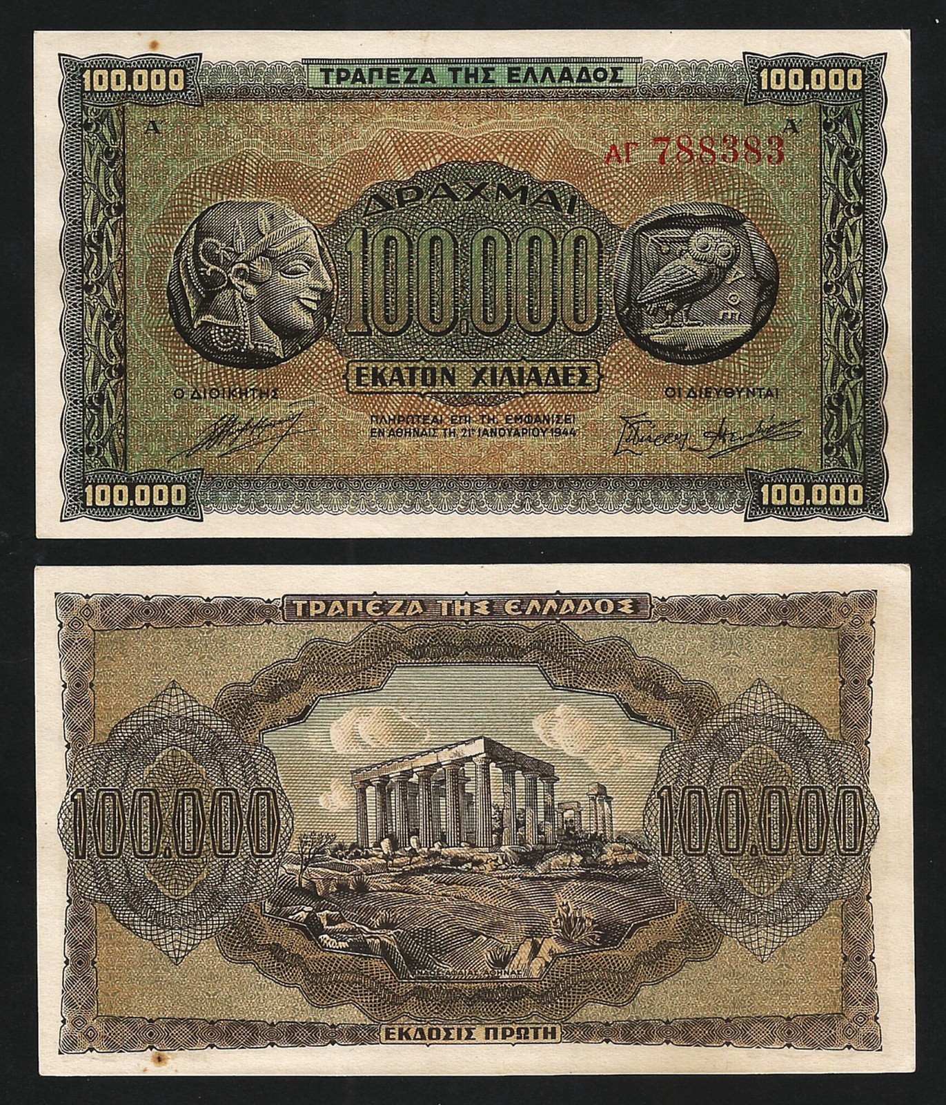 Greece 100,000 100000 Drachmai 1944, aUNC / UNC , P-125a