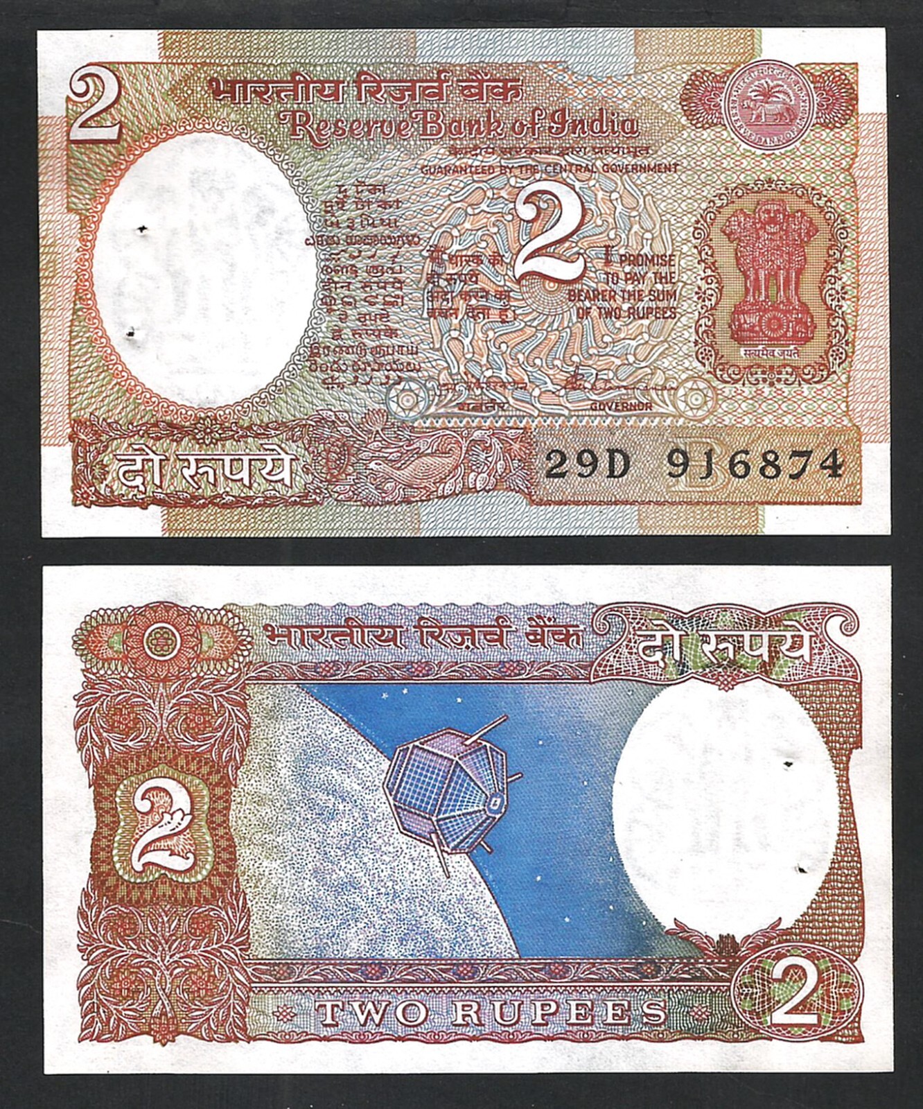 India 2 Rupees 1976, aUNC, P-79 L Sign 86 Letter B, Space Craft