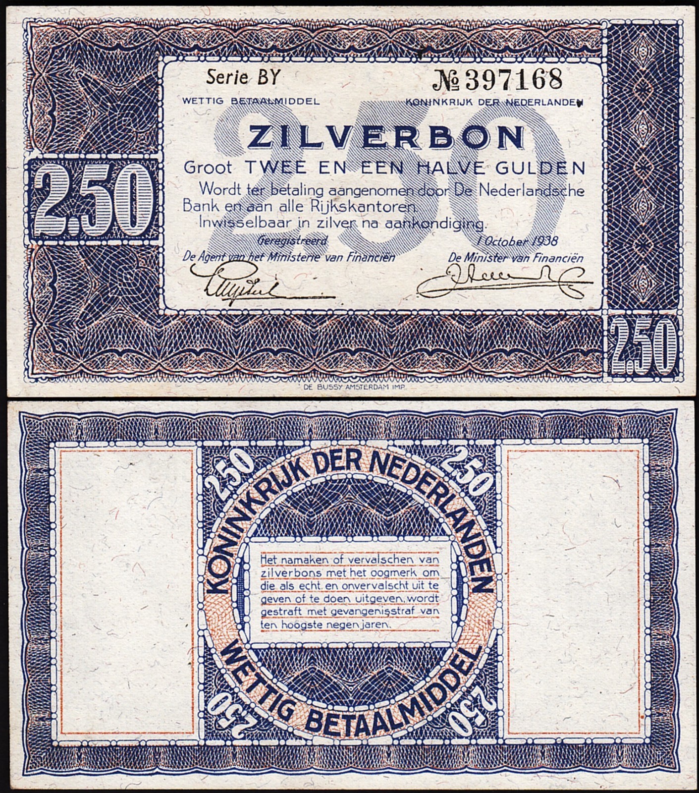 Netherlands 2 ½ Gulden Zilverbon 1938, P-62