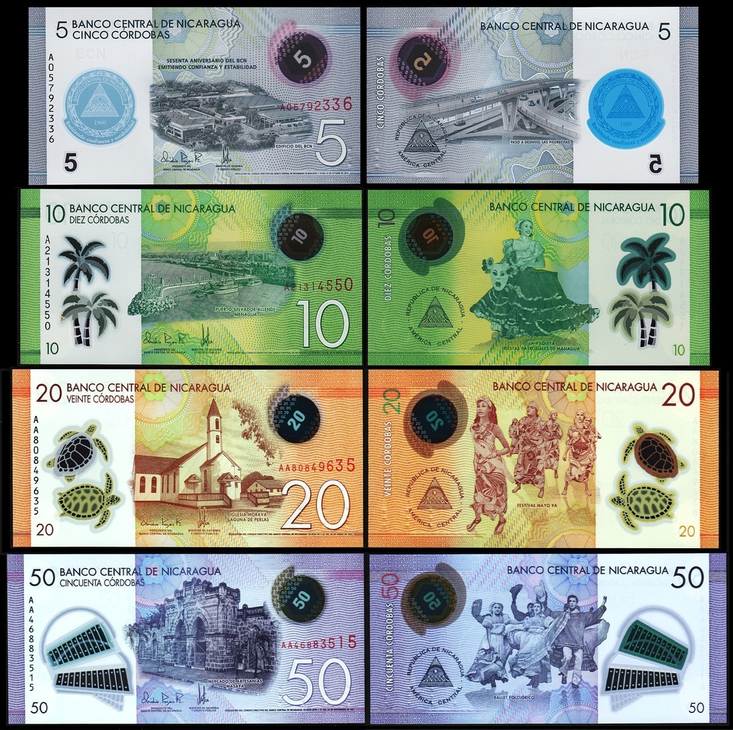 Nicaragua 4 Pcs UNC Set 5 10 20 50 Cordobas, Polymer