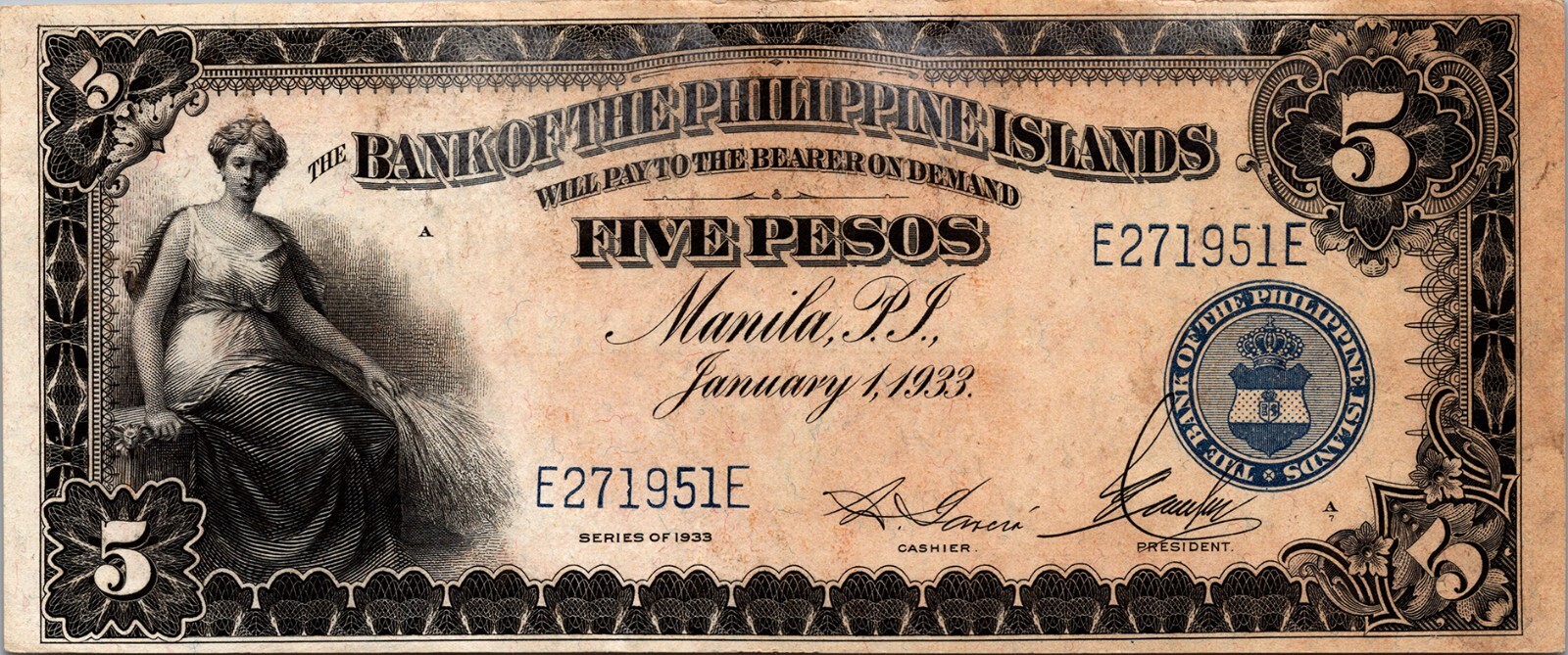 Philippines 5 Pesos 1933, aAU, P-22, Prefix E
