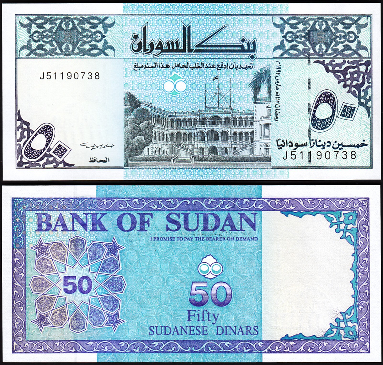 Sudan 50 Dinars, 1992, P-54d , Prefix J