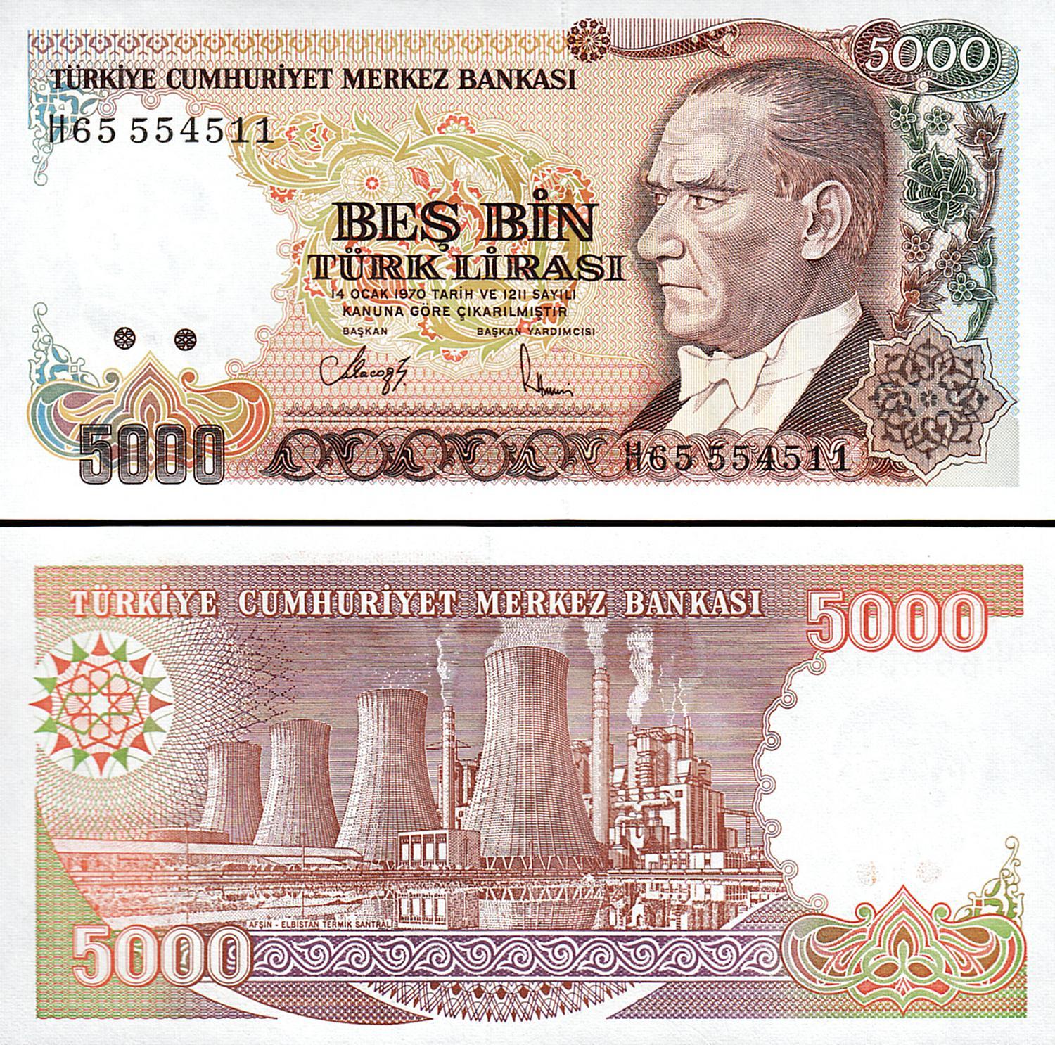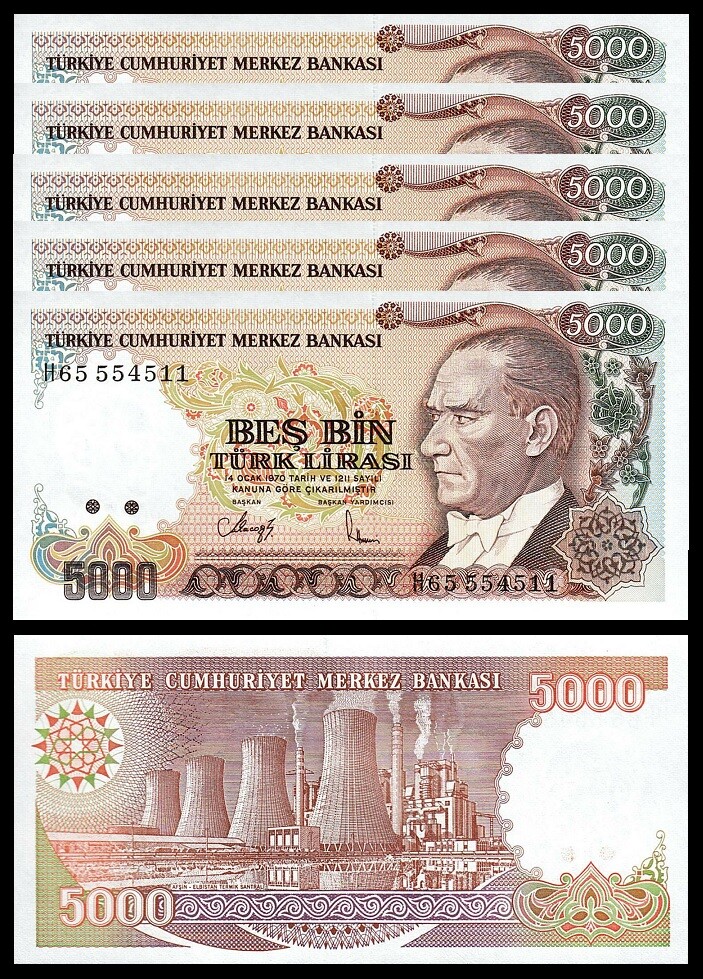 TURKEY 5000 5,000 LIRA 1990 (1970) P 198 PREFIX H or I