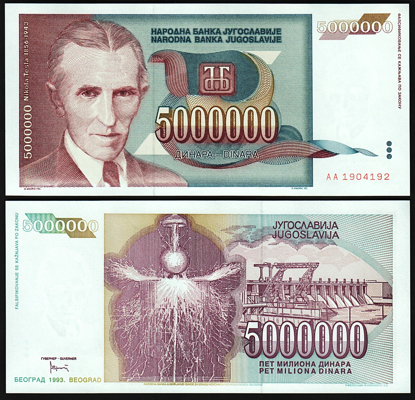 Yugoslavia 5000000 5,000,000 5 Million Dinara 1993, P-121, Prefix AA