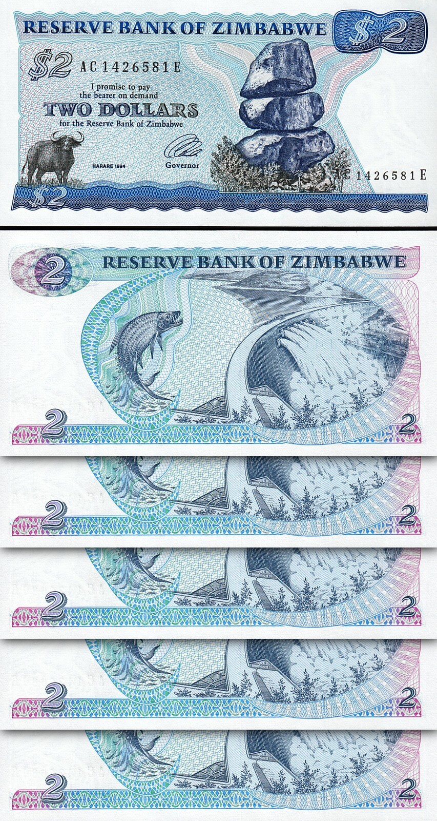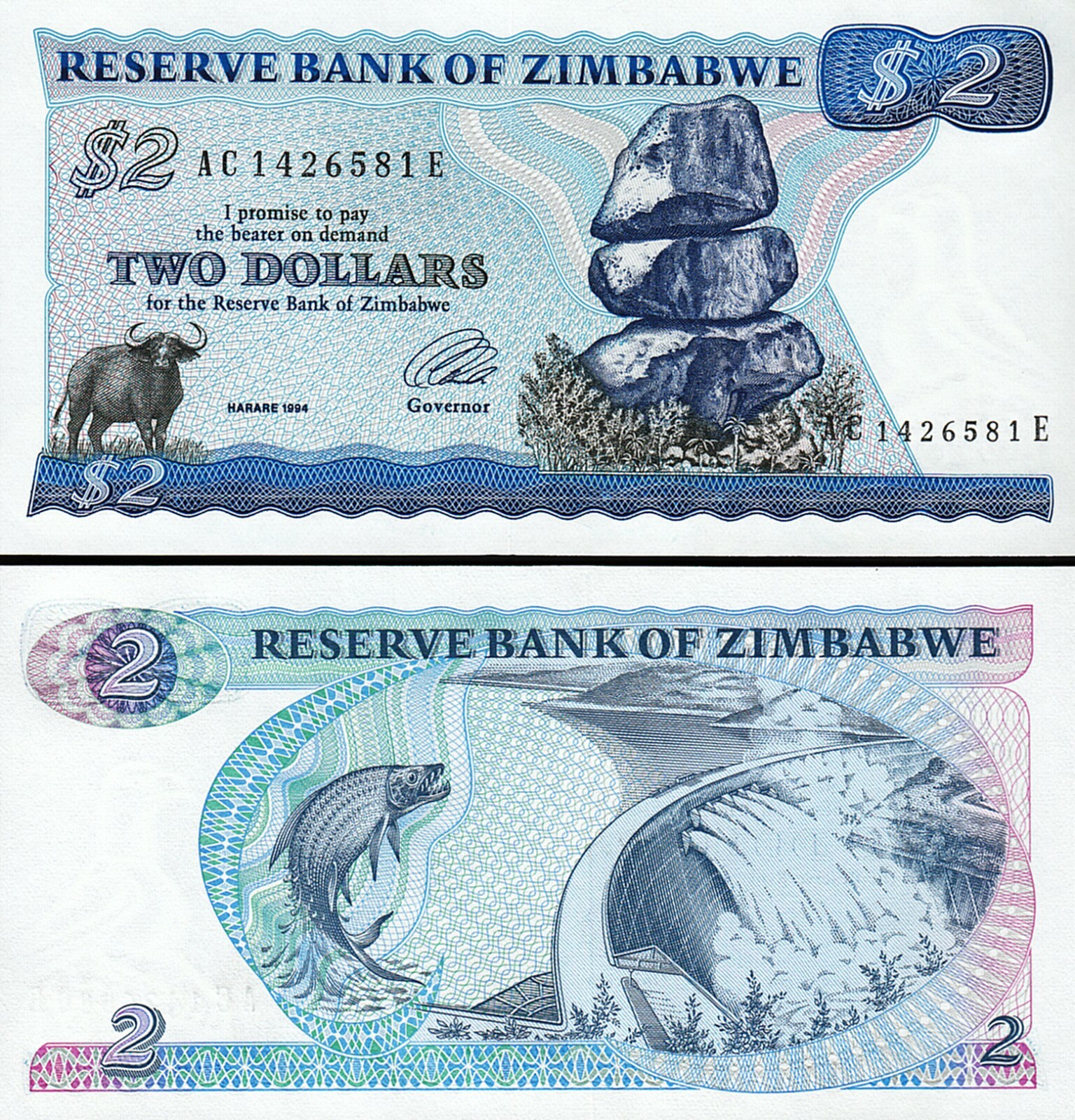 ZIMBABWE 2 DOLLARS 1994, P-1C, PREFIX AC SUFFIX E