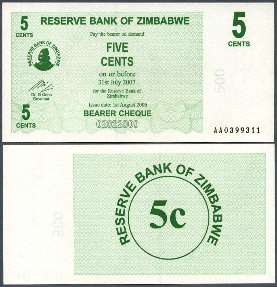 ZIMBABWE 5 CENT 2006, P.34, BEARER CHEQUE, PREFIX AA